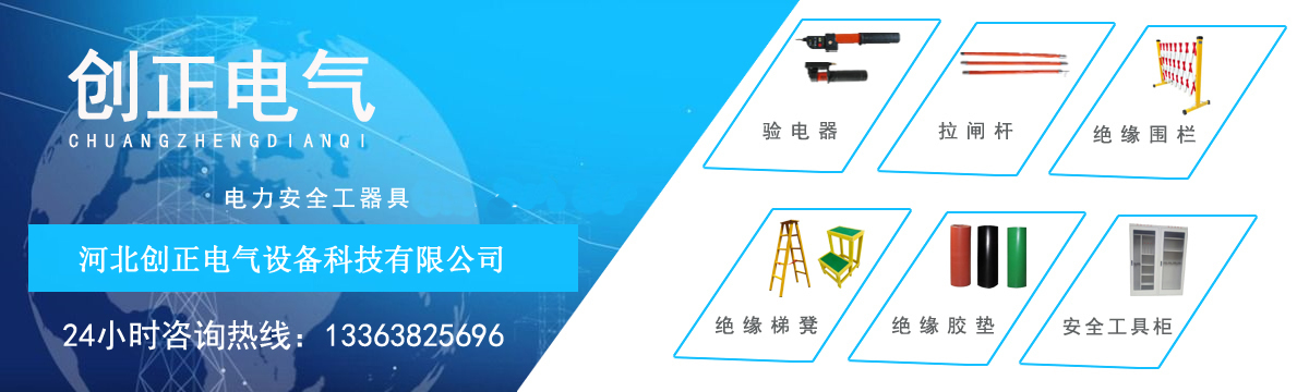 河北创正电气设备科技有限公司主要经营产品包括:高压验电器、高压接地线、高压拉闸杆、绝缘橡胶垫、绝缘伸缩围栏、绝缘梯、安全工具柜、绝缘凳、挡鼠板、安全警示带、绝缘台、安全带、脚扣、安全帽、标识牌、绝缘手套、绝缘靴等电力安全工器具。公司以“服务电力系统,努力永无止境”为目标,以“人才就是生产力”为战略,以经验为依托,以理念为指导,以员工为基础,以市场为支撑,贯彻“以顾客需求为上”的经营理念,以合格的质量,合理的价位,适应市场的需求。